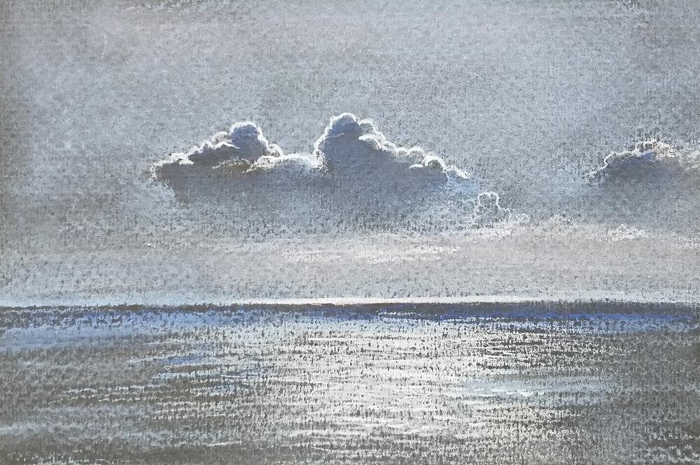 From the perspective of the artist, this small pastel artwork conveys a sense of tranquility in a coastal setting. The artist portrays a calm and serene sea, with the focal point of the composition being a softly glowing cloud that emanates a warm, gentle light. The sea is tranquil and smooth, reflecting the faint glimmers of the cloud, creating a magical shimmer on its surface. This piece evokes a feeling of peace and invites viewers to immerse themselves in the tranquil beauty of the maritime and celestial landscape, where time appears to stand still. From the perspective of the artist, this small pastel artwork conveys a sense of tranquility in a coastal setting. The artist portrays a calm and serene sea, with the focal point of the composition being a softly glowing cloud that emanates a warm, gentle light. The sea is tranquil and smooth, reflecting the faint glimmers of the cloud, creating a magical shimmer on its surface. This piece evokes a feeling of peace and invites viewers to immerse themselves in the tranquil beauty of the maritime and celestial landscape, where time appears to stand still. |