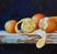 This still life depicts lemons and oranges arranged on a weathered wooden shelf, some whole and some partially peeled.