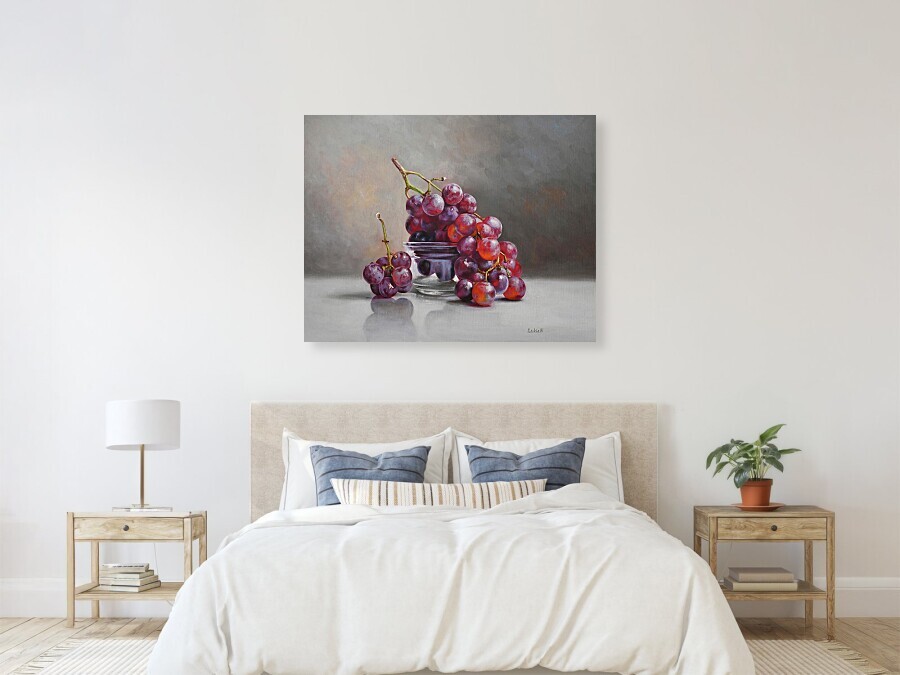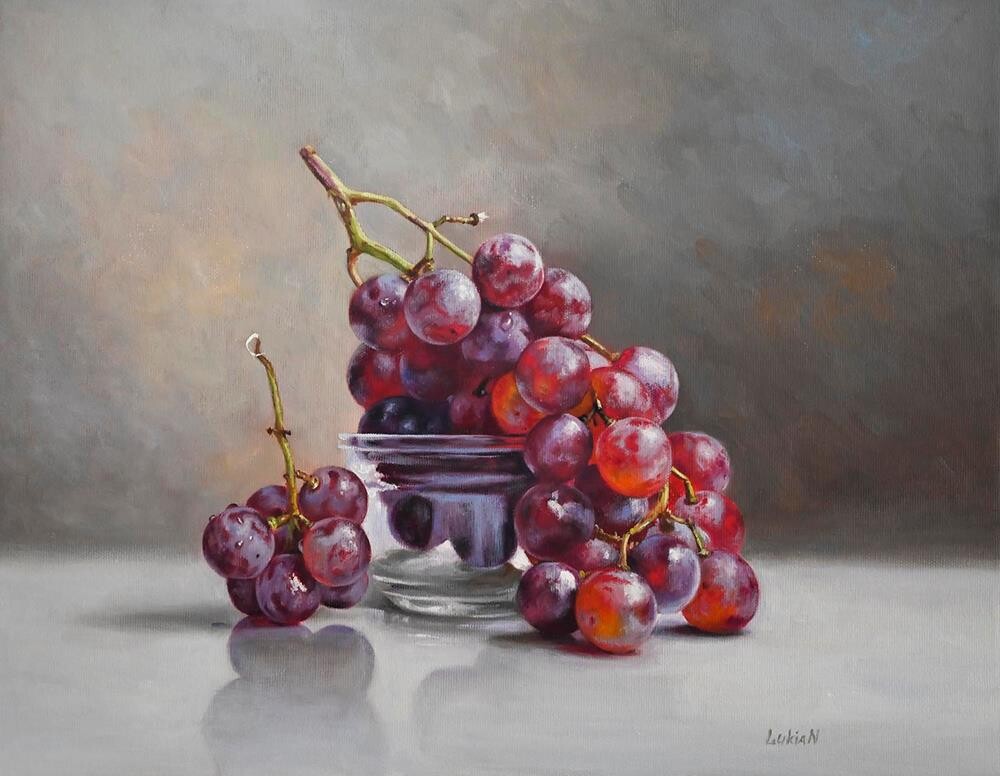 This original oil painting by Lukian captures the exquisite interplay of light, texture, and transparency. Featuring a cluster of lush red grapes resting against a delicate glass vessel, the artwork showcases a stunning balance between high-detail realism and soft, painterly expression.