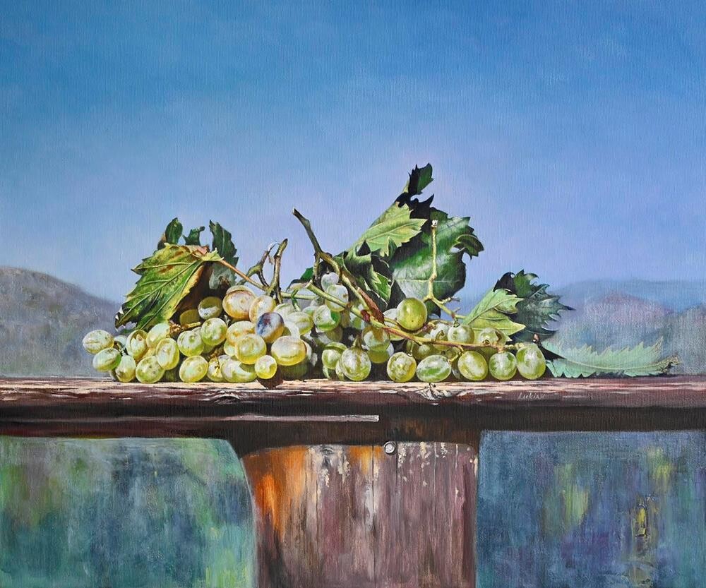 This still life was painted from life during a short stay at Ratko Art Residences in the mountains of Montenegro. I was inspired by the ripe white grapes with their subtle color variations and the way they naturally rested on an old wooden surface against the soft landscape near Lake Skadar. The work combines traditional oil painting techniques with a contemporary approach to light, color, and atmosphere. My focus was on quiet observation, materiality, and inner balance rather than narrative detail. The original painting is sold unframed. This still life was painted from life during a short stay at Ratko Art Residences in the mountains of Montenegro. I was inspired by the ripe white grapes with their subtle color variations and the way they naturally rested on an old wooden surface against the soft landscape near Lake Skadar. The work combines traditional oil painting techniques with a contemporary approach to light, color, and atmosphere. My focus was on quiet observation, materiality, and inner balance rather than narrative detail. The original painting is sold unframed. |