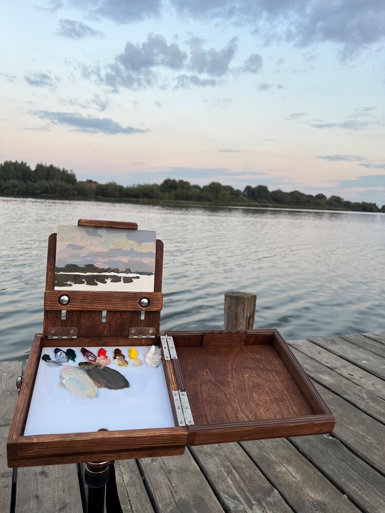 This is the first painting on my new small pochade box. I decided to go to the lake, where there were almost no people, and I was able not only to enjoy the painting process but also a quiet, peaceful sunset.