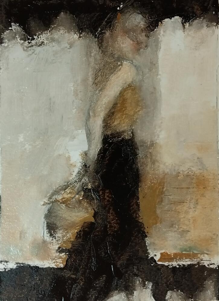 Available through Art House Charlotte. This elegant lady is walking, just taking one step forward. The atmosphere around her is soft and quiet. She is confident in her space.