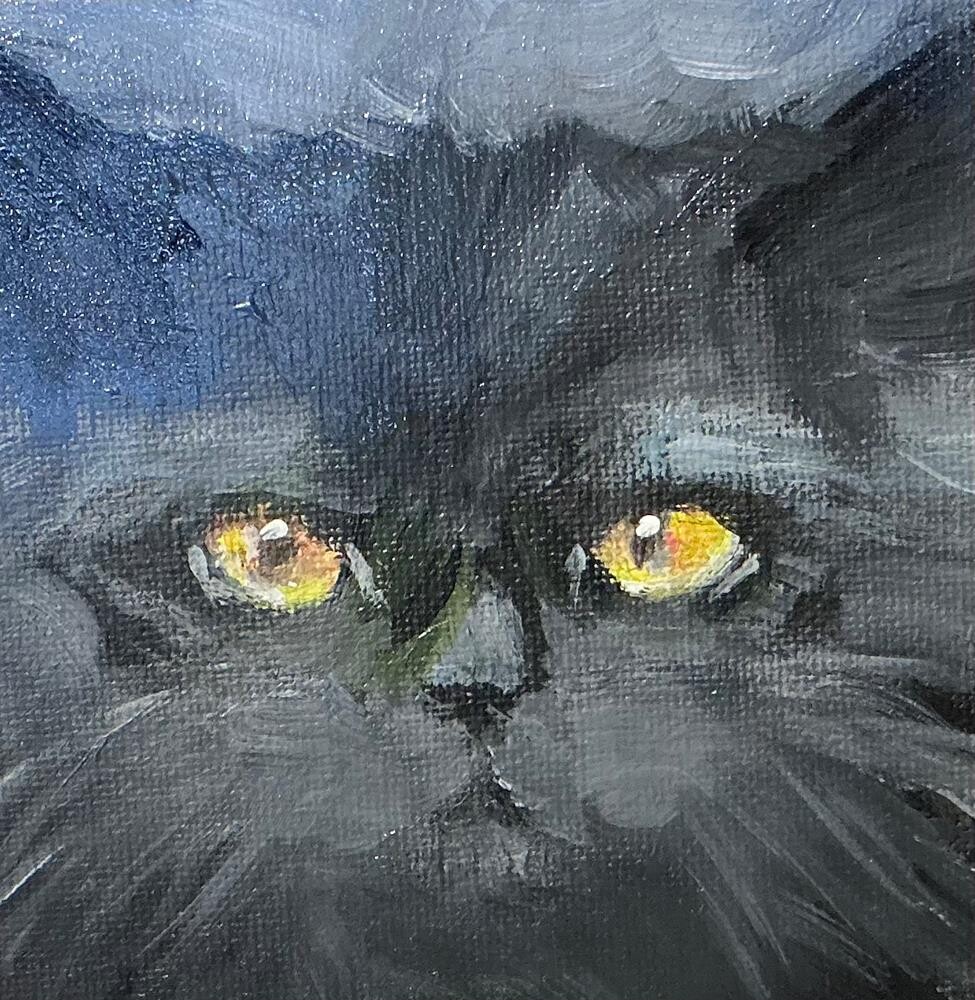 Sometimes my gray cat ...wakes from a nap...walks over to me and has this facial expression ..no sounds or eye blinking...then slowly turns....walks back to where she was...I follow her....pick her up for a quick hug...she lets out a big yawn...and purring begins!