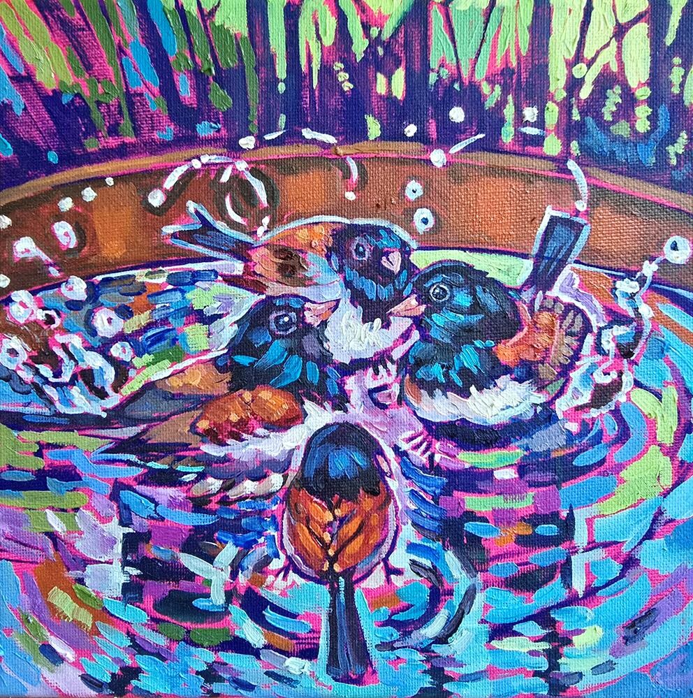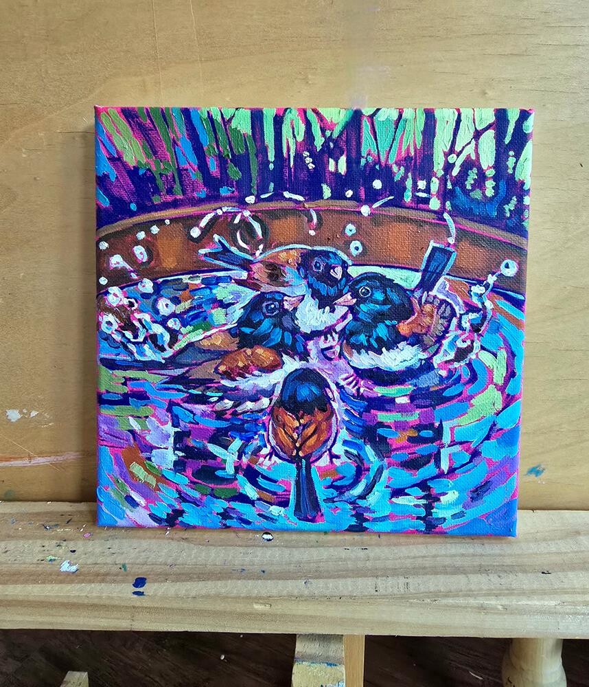 I truly cherish that rare sense of trust. Because she is a frequent solo visitor—often busy foraging for aphids or enjoying the water—I wanted to capture her entire essence. This painting is a collection of those moments, brought together from several photos I’ve taken over time to show her from every beautiful angle. ---- This is an original work of art by Bhavna Misra. Painted in bold brushwork in her signature style.