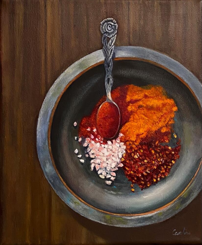 I am drawn to the everyday beauty found in simple familiar objects and this painting celebrates the vibrant colours and the textures of the ingredients that can "add some spice" to our lives. I especially liked painting the old worn metalwork which adds another dimension to this work, a well used intricate spoon and plate, maybe passed down through generations. My art is a tribute to the sensory pleasures that connect us reminding us that even the smallest elements can add depth and meaning to our daily lives. I am drawn to the everyday beauty found in simple familiar objects and this painting celebrates the vibrant colours and the textures of the ingredients that can "add some spice" to our lives. I especially liked painting the old worn metalwork which adds another dimension to this work, a well used intricate spoon and plate, maybe passed down through generations. My art is a tribute to the sensory pleasures that connect us reminding us that even the smallest elements can add depth and meaning to our daily lives. |