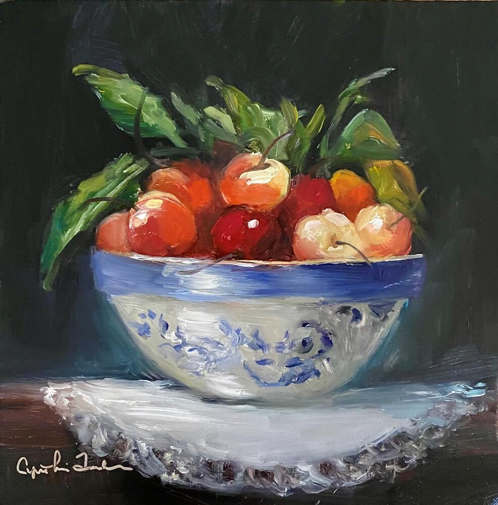 Cheerful little painting! Had fun getting the glow in these pretty cherries.. as well as the lace edged doily they sit on. Thanks for looking! Cheerful little painting! Had fun getting the glow in these pretty cherries.. as well as the lace edged doily they sit on. Thanks for looking! |
