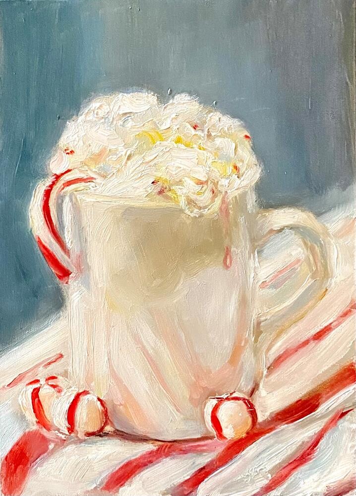 Reflections on a mug of hot cocoa with lots of whipped cream and a peppermint stirrer! High key and happy painting! Would look awesome on your coffee/cocoa bar on a little easel!! Reflections on a mug of hot cocoa with lots of whipped cream and a peppermint stirrer! High key and happy painting! Would look awesome on your coffee/cocoa bar on a little easel!! |