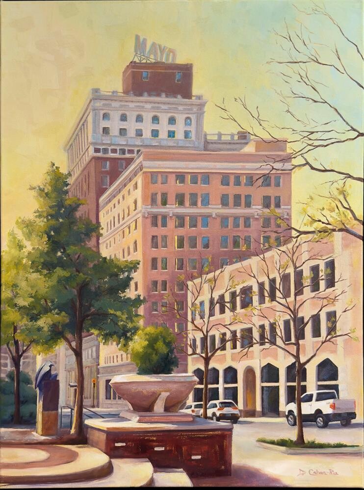 This piece was awarded "Best of Show" in the ART ABOUT TOWN juried art exhibit in Tulsa Oklahoma and is currently on exhibit in the 101 ARCHER GALLERY located in the Tulsa arts district. The painting shows the view from Main and 5th street which was formerly known as Bartlett Square. Looking west from this corner is a view of the historical Mayo Hotel. I was inspired to paint this scene when visiting the area one evening at the perfect moment when the atmosphere was just right to cause the setting sun to make the whole sky glow a gorgeous yellow. I hope you enjoy this scene as much as I do. This painting is oil on a 2 inch thick canvas with the scene continuing around the sides so it looks good with or without a frame. If interested in purchasing with a frame, please contact me. This piece was awarded "Best of Show" in the ART ABOUT TOWN juried art exhibit in Tulsa Oklahoma and is currently on exhibit in the 101 ARCHER GALLERY located in the Tulsa arts district. The painting shows the view from Main and 5th street which was formerly known as Bartlett Square. Looking west from this corner is a view of the historical Mayo Hotel. I was inspired to paint this scene when visiting the area one evening at the perfect moment when the atmosphere was just right to cause the setting sun to make the whole sky glow a gorgeous yellow. I hope you enjoy this scene as much as I do. This painting is oil on a 2 inch thick canvas with the scene continuing around the sides so it looks good with or without a frame. If interested in purchasing with a frame, please contact me. |