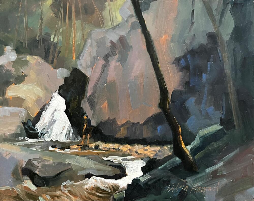 This is an oldie but goodie. Painted during the Harford Plein Air, years ago. I hiked in to get to those falls, well over a mile. As I was completing the painting, I realized that no one could understand how huge the boulders were. Just then a hiker, in black gear, walked up and stood there for probably 10 or 15 minutes, just looking at the water! Couldn’t believe my good fortune! Painted him in as fast as I could! I hiked the painting out in 2 trips. One trip with just the painting. The second trip, to get my gear. On the way back, I was nearly run over by a half dozen horses! They were being lead to the water! I’m not sure I’d have the strength or stamina to paint this, now. This is an oldie but goodie. Painted during the Harford Plein Air, years ago. I hiked in to get to those falls, well over a mile. As I was completing the painting, I realized that no one could understand how huge the boulders were. Just then a hiker, in black gear, walked up and stood there for probably 10 or 15 minutes, just looking at the water! Couldn’t believe my good fortune! Painted him in as fast as I could! I hiked the painting out in 2 trips. One trip with just the painting. The second trip, to get my gear. On the way back, I was nearly run over by a half dozen horses! They were being lead to the water! I’m not sure I’d have the strength or stamina to paint this, now. |