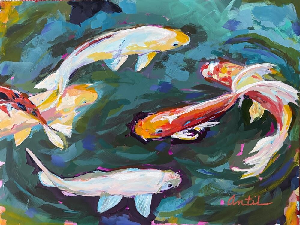 I love trying to capture the movement and grace of koi. This was painted on 7/8" cradled panel with sides unpainted in natural birch. It's ready to hang without a frame. I love trying to capture the movement and grace of koi. This was painted on 7/8" cradled panel with sides unpainted in natural birch. It's ready to hang without a frame. |