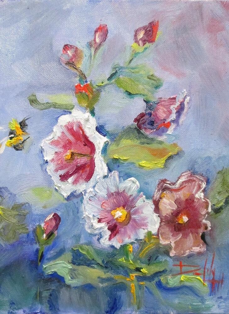 Hollyhocks and Bee