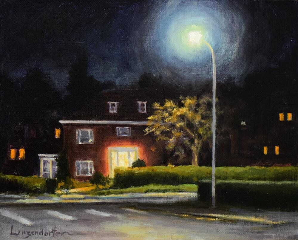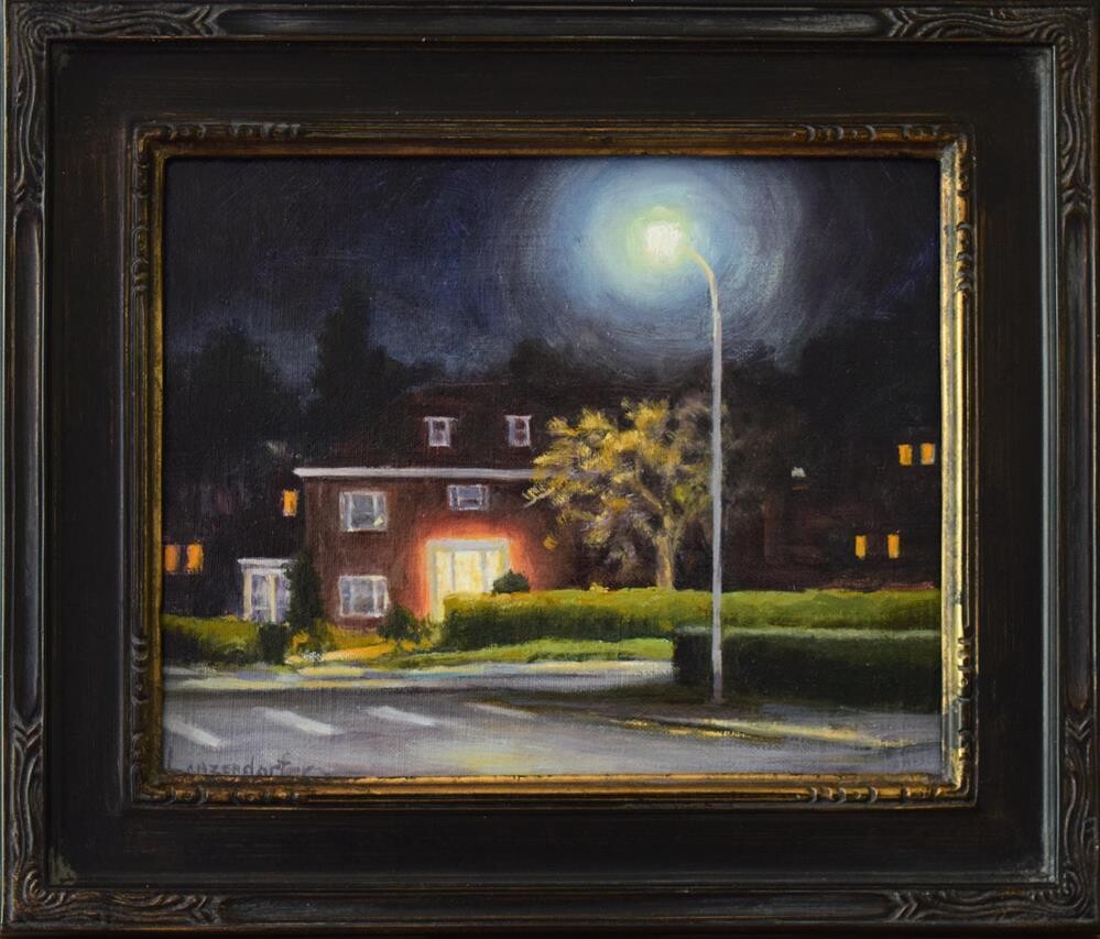 STUDIO SALE Paintings from my studio - for a short time only - unframed with Free Shipping - get them while you can! After Hours was $495. NOW $365. See more Studio Sale at www.djlanzendorferfineart.com See a larger image of this painting at www.djlanzendorferfineart.com VIP INSIDERS EMAIL NEWSLETTER - Join my insiders mailing list and receive a VIP newsletter - get a first look at what's new and happening in the art world. https://djlanzendorferfineart.com/email-newsletter FOREIGN PURCHASES – We are happy to accommodate foreign sales whenever possible. Please contact us for availability and exact shipping costs. Sorry, no free shipping outside the continental USA. AFTER HOURS This quiet street late at night with no one there, only a few lights in homes and along the way. It feels peaceful and safe along the street, After Hours. I am enjoying painting nocturnes and I hope you enjoy them as much as I do. This is an original oil painting, painted by me, DJ Lanzendorfer. This painting is oil on linen canvas laid down on board, 8” x 10”, unframed with FREE Shipping included. Although this painting is unframed, I have included an image of it in a frame so you can see how it will look.
