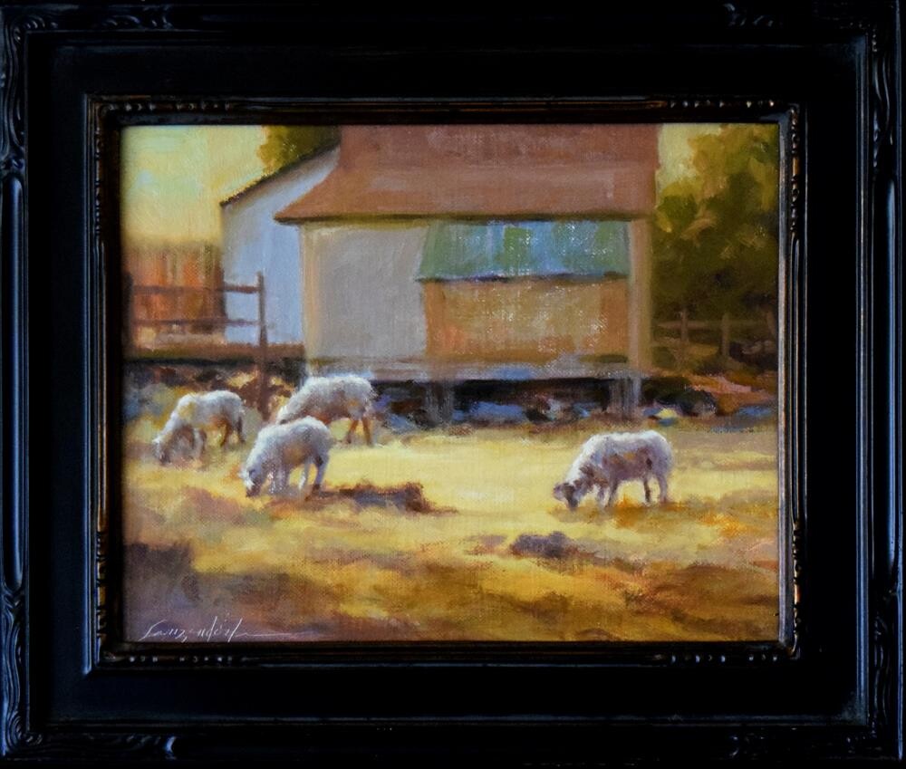 BRUNCH We lived in rural community in California’s Gold Rush area for several years. I painted plein air for a long time there, and one day saw these buildings, pasture full of rocks and several sheep grazing happily among the rocks. Golden light fell on everything and I decided to paint this then and there. This is an original oil painting, painted by me, DJ Lanzendorfer, and is 8" x 10" , oil on linen canvas, laid down on board and is sold unframed. This painting will fit a ready-made frame.
