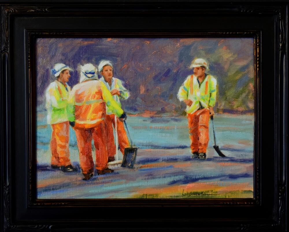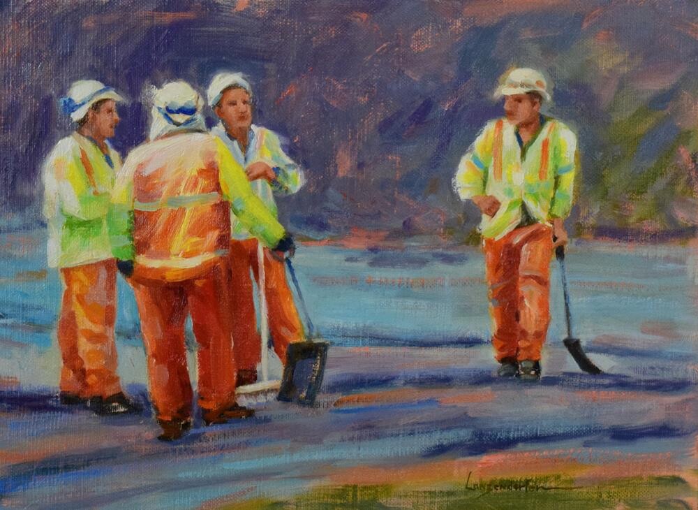 COMMITTEE MEETING Seen at the side of the road in their colorful safety gear – Hot orange, bright yellow and chartreuse green colors don't come up every day and this was too good to miss a chance to paint them. Who could resist? This original oil painting was painted on linen canvas, it is 9" x 12", painted by me, DJ Lanzendorfer, and is unframed with FREE shipping included. See a larger image of this painting at www.djlanzendorferfineart.com Although this painting is unframed, I have included an image of it in a frame so you can see how it will look. STUDIO SALE Paintings from my studio - for a short time only - unframed with Free Shipping - get them while you can! Committee Meeting was $600. NOW $500. See more Studio Sale at www.djlanzendorferfineart.com Sign up for my newsletter where you will get a first look at new paintings and upcoming events in the art world. https://djlanzendorferfineart.com/email-newsletter. FOREIGN PURCHASES – We are happy to accommodate foreign sales whenever possible. Please contact us for availability and exact shipping costs. COMMITTEE MEETING Seen at the side of the road in their colorful safety gear – Hot orange, bright yellow and chartreuse green colors don't come up every day and this was too good to miss a chance to paint them. Who could resist? This original oil painting was painted on linen canvas, it is 9" x 12", painted by me, DJ Lanzendorfer, and is unframed with FREE shipping included. See a larger image of this painting at www.djlanzendorferfineart.com Although this painting is unframed, I have included an image of it in a frame so you can see how it will look. STUDIO SALE Paintings from my studio - for a short time only - unframed with Free Shipping - get them while you can! Committee Meeting was $600. NOW $500. See more Studio Sale at www.djlanzendorferfineart.com Sign up for my newsletter where you will get a first look at new paintings and upcoming events in the art world. https://djlanzendorferfineart.com/email-newsletter. FOREIGN PURCHASES – We are happy to accommodate foreign sales whenever possible. Please contact us for availability and exact shipping costs. |