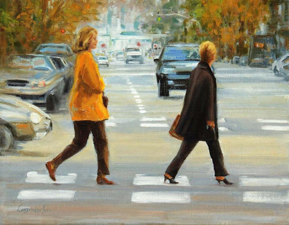Have you ever been caught between lights in a crosswalk. That is what is happening here with both ladies quickly stepping to get across the street. I loved the colors in this scene, warm golds, the bright gold jacket, and cool street colors make such a nice contrast. This is an original oil painting, painted by me, DJ Lanzendorfer, 11" x 14", oil on linen, unframed with Free shipping included. Although this painting is unframed, I have included an image of it in a frame so you can see how it will look. See a larger image of this painting at www.djlanzendorferfineart.com Join my insiders mailing list and receive a VIP newsletter - get a first look at what's new and happening in the art world. https://djlanzendorferfineart.com/email-newsletter FOREIGN PURCHASES – We are happy to accommodate foreign sales whenever possible. Please contact us for availability and exact shipping costs. Free shipping available only for paintings sold in the Continental USA.