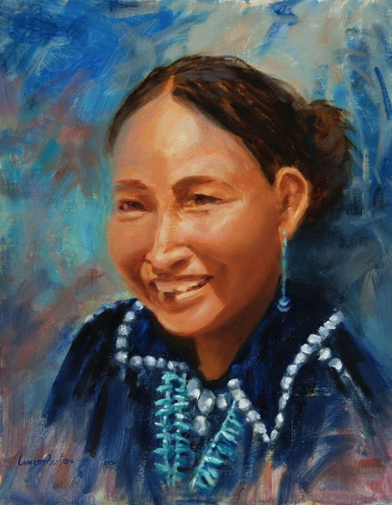 This young Navajo girl, dressed in dark blue cotton velvet was standing in front of her summer Wikiup. I loved the smile on this girl's face - it just makes you want to smile along with her. I hope I was able to capture that smile for you in this painting. This painting is painted by me, DJ Lanzendorfer ,it is 14" x 11", oil on linen and is unframed with free shipping included.