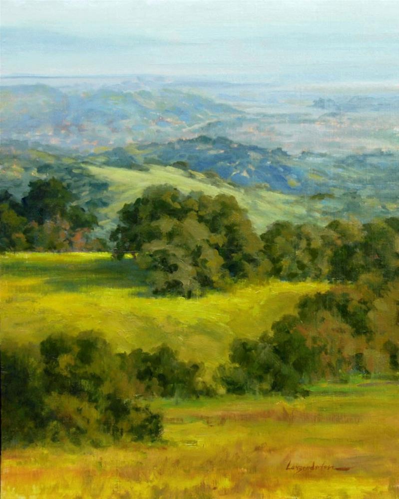 Standing on the top of a hill you can look as far as you like in each direction. The atmosphere turns soft blue and lightens as you look further off to the bay and beyond. This painting is 16" x 20", painted by me DJ Lanzendorfer, oil on linen and is unframed with free shipping included.