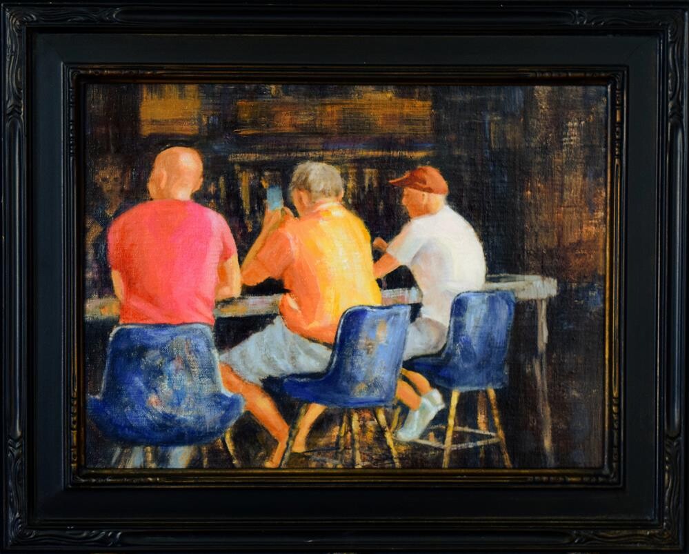 RUB A DUB DUB – THREE MEN IN A PUB Seeing these three men wearing bright colored t-shirts and shorts against the dark cool background of the bar made an excellent subject for a painting. This painting is painted by me, DJ Lanzendorfer, it is oil on linen, 9” x 12”, and is unframed with free shipping included. It will fit a ready made frame. Although this painting is unframed, I have included an image of it in a frame so you can see how it will look. See a larger image of this painting at www.djlanzendorferfineart.com Join my insiders mailing list and receive a VIP newsletter - get a first look at what's new and happening in the art world. https://djlanzendorferfineart.com/email-newsletter FOREIGN PURCHASES – We are happy to accommodate foreign sales whenever possible. Please contact us for availability and exact shipping costs. Free shipping available for paintings sold in the Continental USA. RUB A DUB DUB – THREE MEN IN A PUB Seeing these three men wearing bright colored t-shirts and shorts against the dark cool background of the bar made an excellent subject for a painting. This painting is painted by me, DJ Lanzendorfer, it is oil on linen, 9” x 12”, and is unframed with free shipping included. It will fit a ready made frame. Although this painting is unframed, I have included an image of it in a frame so you can see how it will look. See a larger image of this painting at www.djlanzendorferfineart.com Join my insiders mailing list and receive a VIP newsletter - get a first look at what's new and happening in the art world. https://djlanzendorferfineart.com/email-newsletter FOREIGN PURCHASES – We are happy to accommodate foreign sales whenever possible. Please contact us for availability and exact shipping costs. Free shipping available for paintings sold in the Continental USA. |