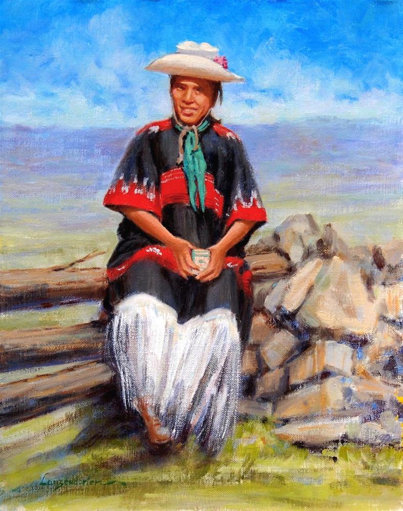 Sitting Pretty was inspired by this woman sitting on a log and stone fence in Mexico. She was so colorful with her poncho and hat with a pink flower in it, I just couldn't resist painting her. This painting was painted by me DJ Lanzendorfer, oil on linen and is unframed with free shipping included.