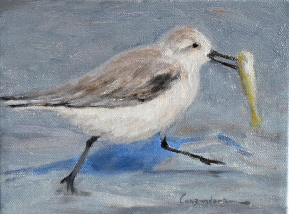 SPEAR FISHING Running along the edge of the ocean this cute little bird has made a great catch for his dinner. I used soft greys and blues to emphasize the coastal foggy weather conditions. This is an original oil painting, painted by me, DJ Lanzendorfer, it is 6” x 8”, oil on stretched canvas and is unframed. This painting is finished on the sides and is ready to hang as it is or it will fit nicely into a frame. See a larger image of this painting at www.djlanzendorferfineart.com VIP INSIDERS EMAIL NEWSLETTER - Join my insiders mailing list and receive a VIP newsletter - get a first look at what's new and happening in the art world. https://djlanzendorferfineart.com/email-newsletter FOREIGN PURCHASES – We are happy to accommodate foreign sales whenever possible. Please contact us for availability and exact shipping costs. Sorry, no free shipping outside the continental USA.