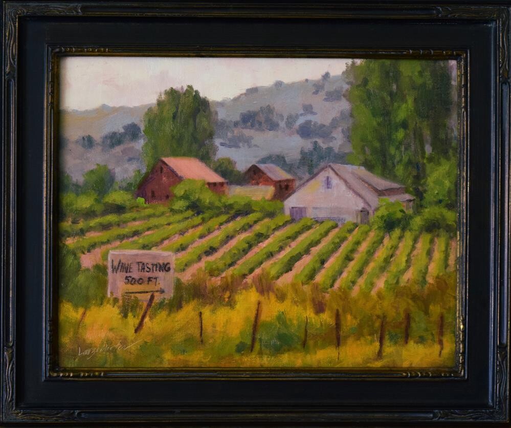 WINE TASTING Driving along the foothills of California, (where everyone wants their own vineyard) I spotted this overgrown barn and house, some vines and lots of weeds – and the sign ‘Wine Tasting’. I couldn’t resist painting it. This is an original oil painting, painted by me DJ Lanzendorfer, it is 11” x 14”, oil paint on linen canvas, unframed with FREE shipping included. Although this painting is unframed, I have included an image of it in a frame so you can see how it will look. See a larger image of this painting at www.djlanzendorferfineart.com VIP INSIDERS EMAIL NEWSLETTER - Join my insiders mailing list and receive my newsletter - get a first look at what's new and happening in the art world. https://djlanzendorferfineart.com/email-newsletter FOREIGN PURCHASES – We are happy to accommodate foreign sales whenever possible. Please contact us for availability and exact shipping costs. Sorry, no free shipping outside the continental USA.