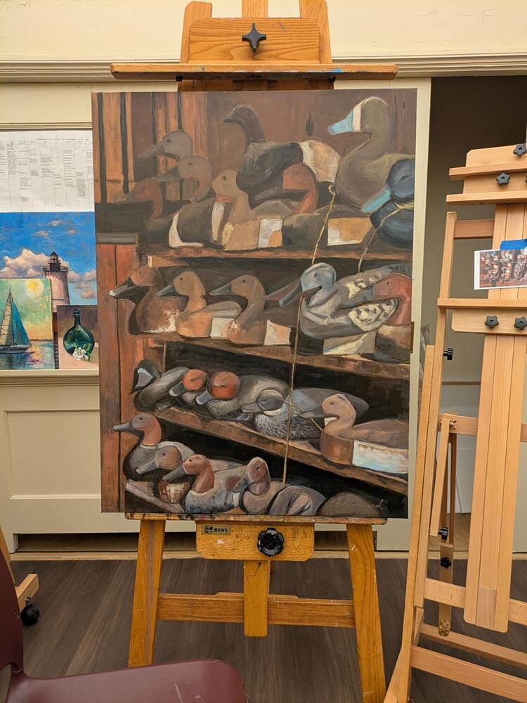 I was invited to paint on Oak Island in Suffolk, Va recently. The owner was big duck hunter and decoy collector. The family has an old horse barn that is repurposed to hold a bunch of antiques and even an apartment. Each horse stall contained different antiques. One was packed with decoys, buoys, and decoy making tools. One of the pictures I took led to this painting. I was invited to paint on Oak Island in Suffolk, Va recently. The owner was big duck hunter and decoy collector. The family has an old horse barn that is repurposed to hold a bunch of antiques and even an apartment. Each horse stall contained different antiques. One was packed with decoys, buoys, and decoy making tools. One of the pictures I took led to this painting. |