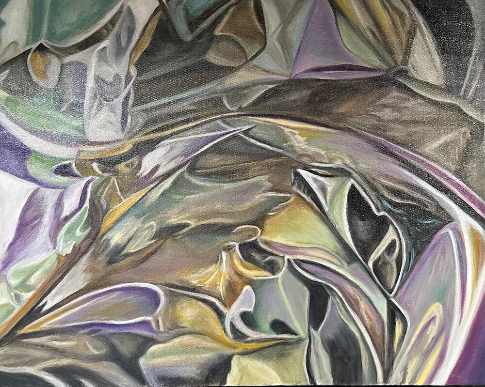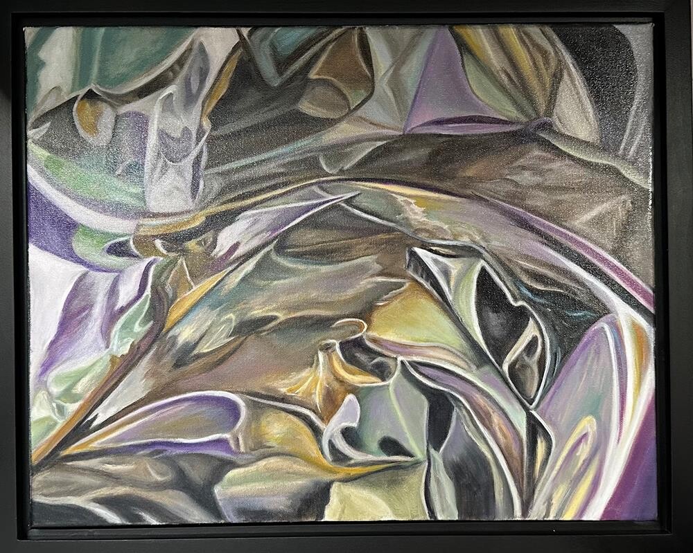 Up close painting of a piece of crumpled aluminum foil. Ships in a black floater frame.