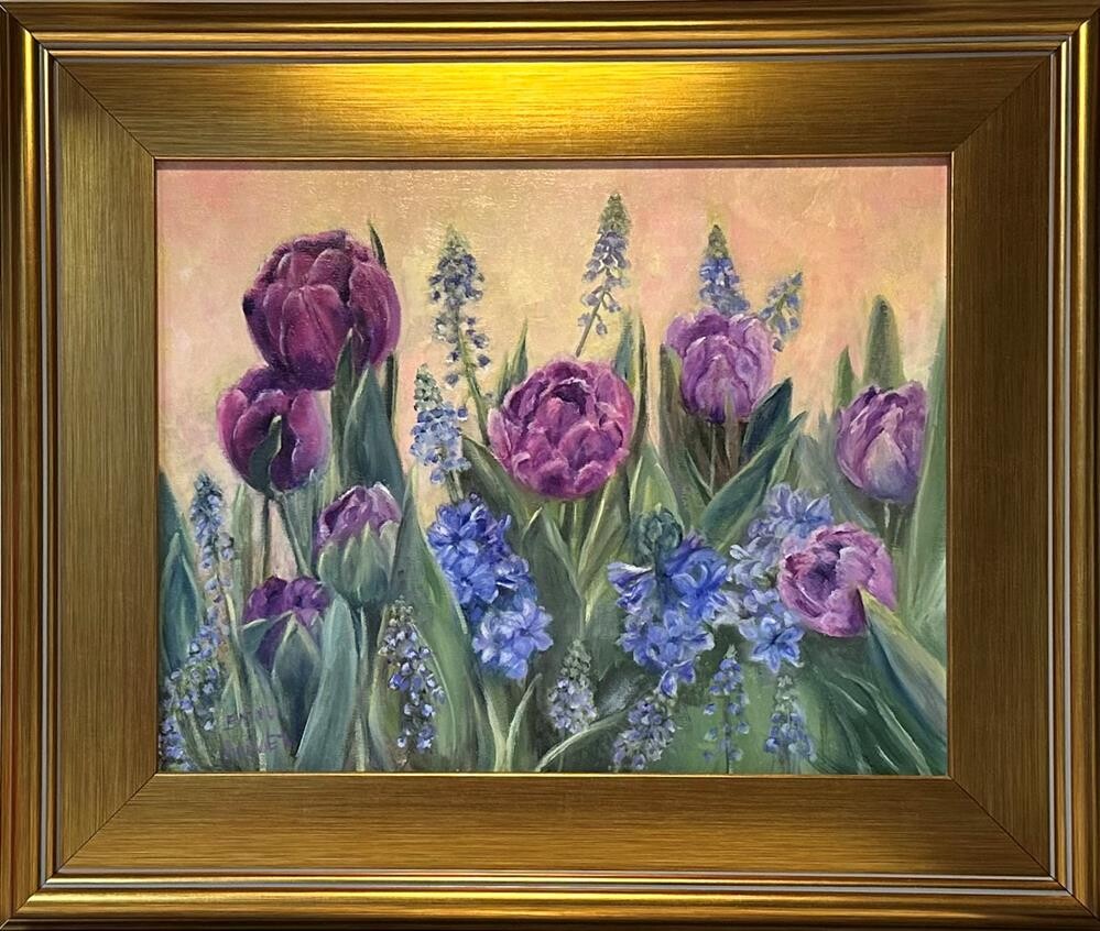 Painted from life from a basket of bulbs gifted me by my son. I couldn’t find a composition I liked, so I painted one angle, turned the basket and painted, etc. Ships in a gold plein aire frame.