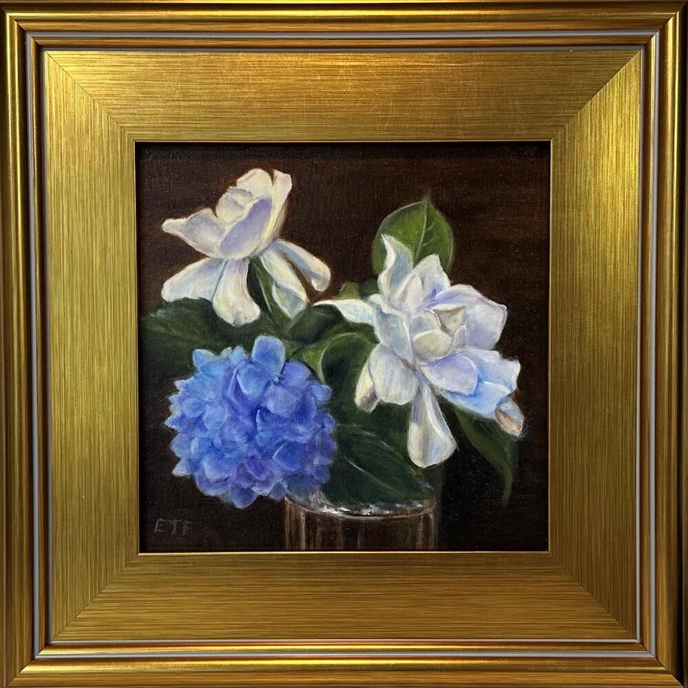 Gardenias and a hydrangea from my garden. They recovered from the freeze of the previous winter and were beautiful this year. Ships in a gold plein aire frame. Gardenias and a hydrangea from my garden. They recovered from the freeze of the previous winter and were beautiful this year. Ships in a gold plein aire frame. |