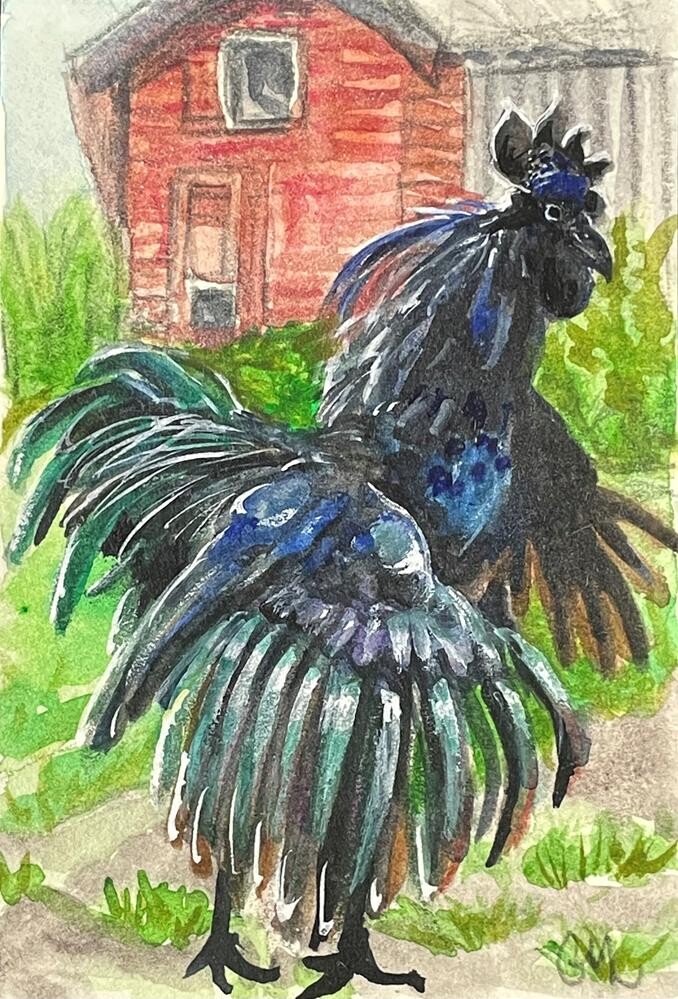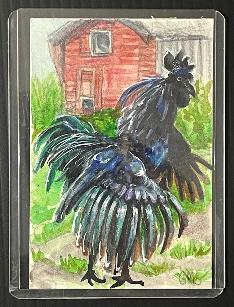 Chit Chat is a miniature painting - only 2.5”x3.75” - of a black rooster crowing. #263 in the Itty Biddies Series of tiny chicken portraits. Watercolor on high quality paper & finished with wax medium. Signed and numbered on the back. Comes in a rigid archival sleeve as seen in 2nd photo. Free shipping Your painting ships within 2 business days. Chit Chat is a miniature painting - only 2.5”x3.75” - of a black rooster crowing. #263 in the Itty Biddies Series of tiny chicken portraits. Watercolor on high quality paper & finished with wax medium. Signed and numbered on the back. Comes in a rigid archival sleeve as seen in 2nd photo. Free shipping Your painting ships within 2 business days. |