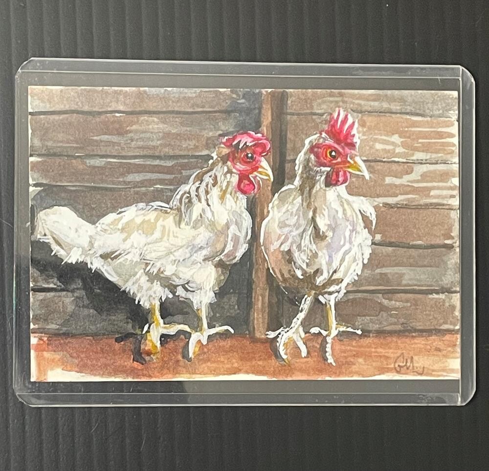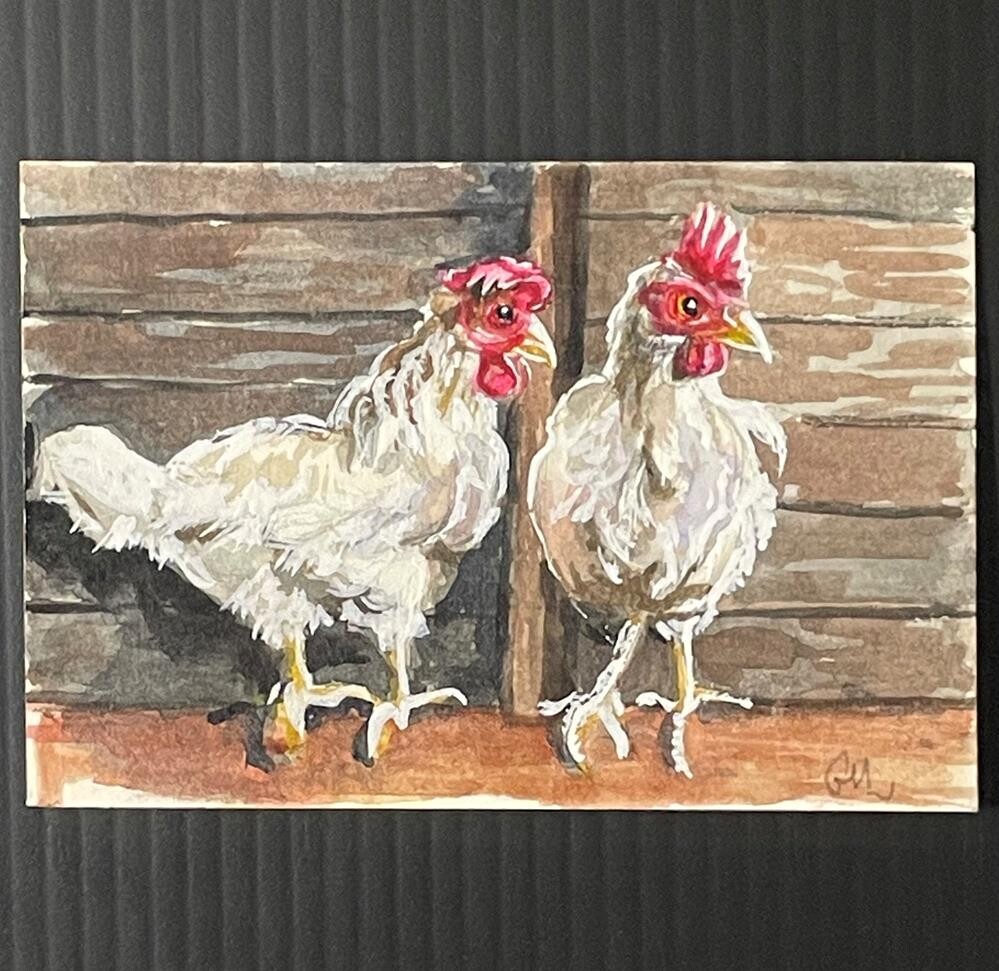 Chit Chat is a miniature painting - only 2.5”x3.75” - of two hens having a little gossip in the coop. #262 in the Itty Biddies Series of tiny chicken portraits. Watercolor on high quality paper & finished with wax medium. Signed and numbered on the back. Comes in a rigid archival sleeve as seen in 2nd photo. Free shipping Your painting ships within 2 business days. Chit Chat is a miniature painting - only 2.5”x3.75” - of two hens having a little gossip in the coop. #262 in the Itty Biddies Series of tiny chicken portraits. Watercolor on high quality paper & finished with wax medium. Signed and numbered on the back. Comes in a rigid archival sleeve as seen in 2nd photo. Free shipping Your painting ships within 2 business days. |