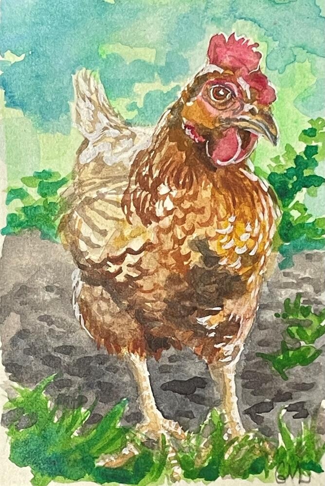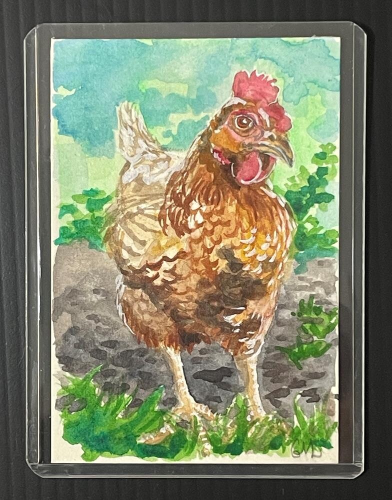 Chit Chat is a miniature painting - only 2.5”x3.75” - of a buff colored hen keeping an eye on things. #261 in the Itty Biddies Series of tiny chicken portraits. Watercolor on high quality paper & finished with wax medium. Signed and numbered on the back. Comes in a rigid archival sleeve as seen in 2nd photo. Free shipping Your painting ships within 2 business days. Chit Chat is a miniature painting - only 2.5”x3.75” - of a buff colored hen keeping an eye on things. #261 in the Itty Biddies Series of tiny chicken portraits. Watercolor on high quality paper & finished with wax medium. Signed and numbered on the back. Comes in a rigid archival sleeve as seen in 2nd photo. Free shipping Your painting ships within 2 business days. |