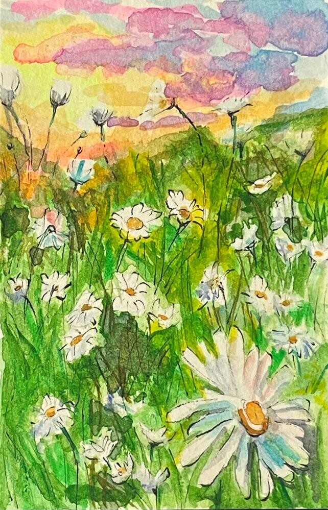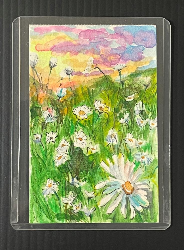Good Morning Daisy is a very small, artist trading card size (2.5”x3.75”). Watercolor and ink painting of a sunrise on a daisy field. The painting ships in a removable, clear, rigid plastic sleeve. Your new painting ships by USPS First Class Mail within 2 business days of purchase. Shipping is free within US. Please message me for current international rates. Good Morning Daisy is a very small, artist trading card size (2.5”x3.75”). Watercolor and ink painting of a sunrise on a daisy field. The painting ships in a removable, clear, rigid plastic sleeve. Your new painting ships by USPS First Class Mail within 2 business days of purchase. Shipping is free within US. Please message me for current international rates. |