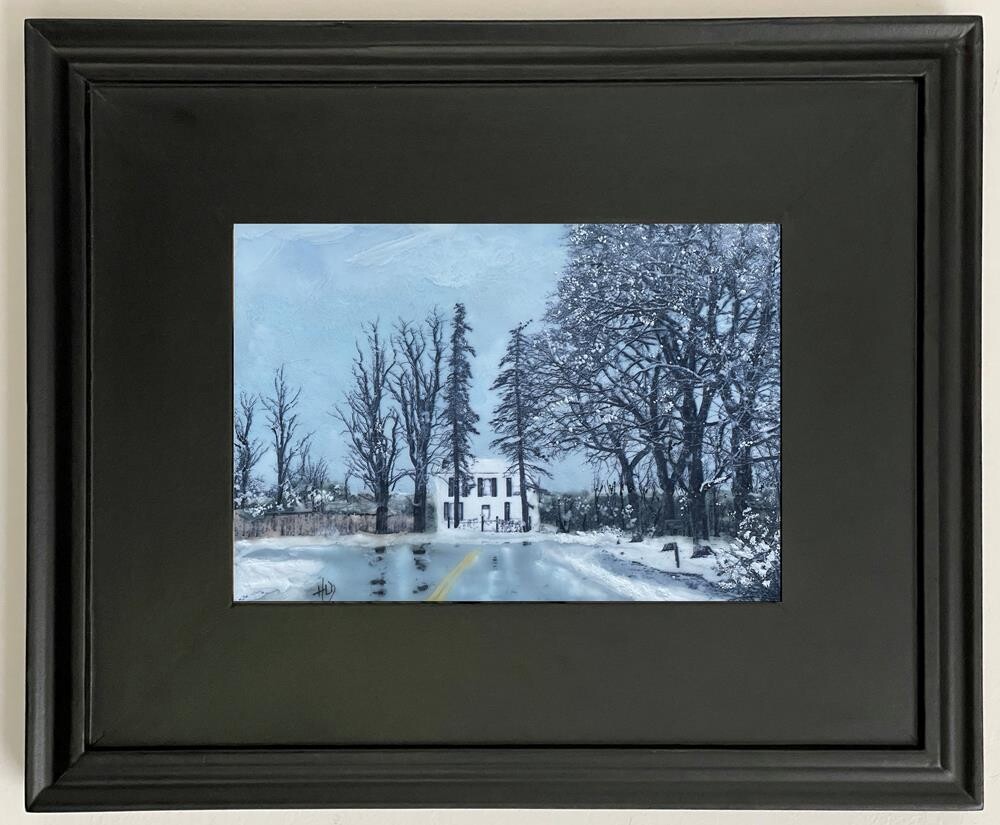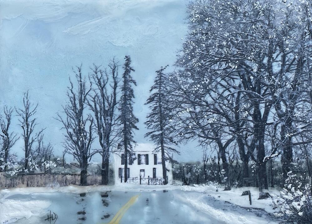$150 for FRAMED piece. Driving in Vermont, just after a snowfall, I came upon this quintessential New England home. It looked so inviting. This is an encaustic which incorporates a toner transfer.(Encaustic is a process in which you paint with melted wax, fusing each layer together. When polished it gives a luminescence not seen in other mediums.)
