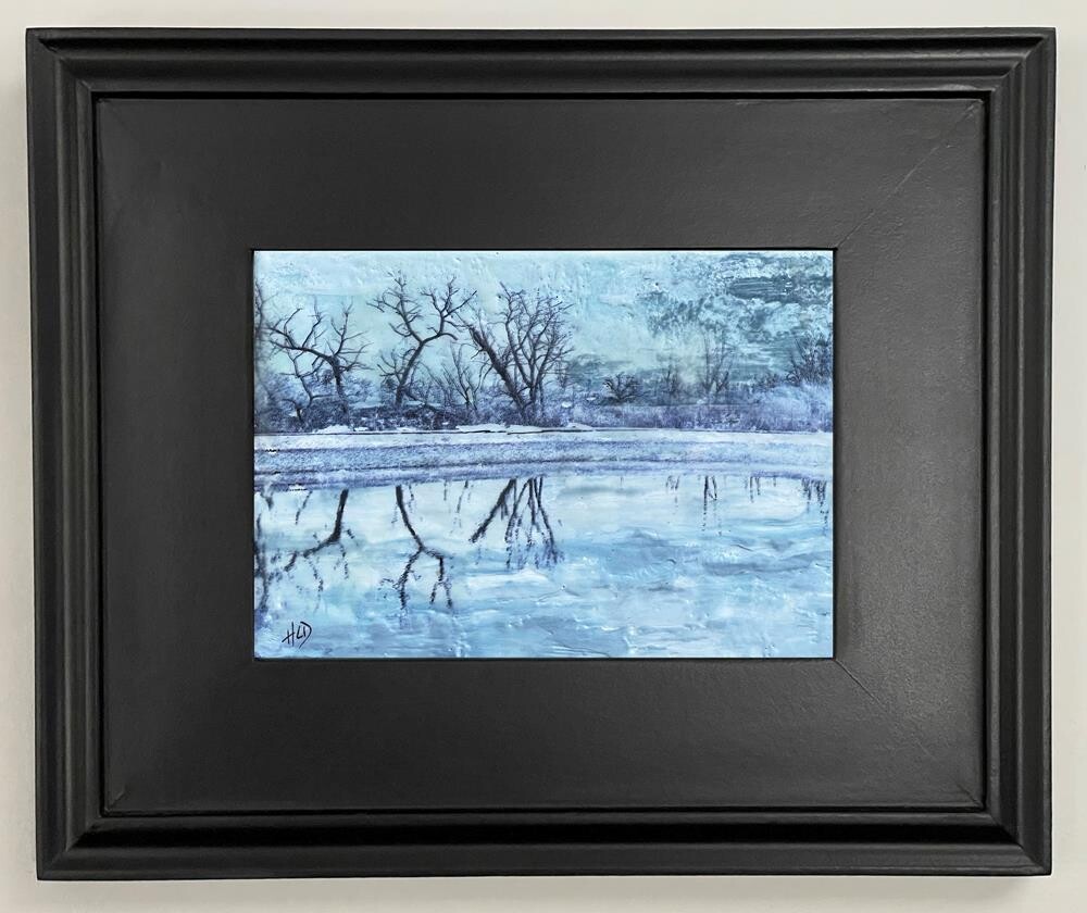 $100 for UNFRAMED piece. $150 for FRAMED piece. This is an encaustic of November trees reflected in a pond. This piece incorporates a toner transfer. (Encaustic is a process in which you paint with melted wax, fusing each layer together. When polished it gives a luminescence not seen in other mediums.)
