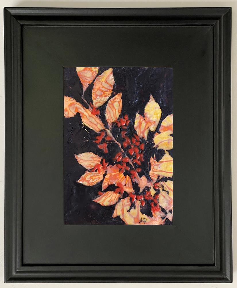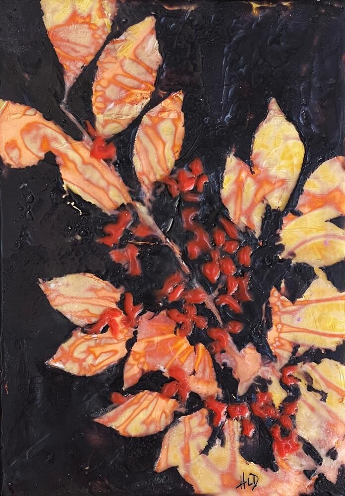 $120 for FRAMED piece In October the euonymus bush produces red berries while the leaves begin to turn. This encaustic piece is the imprinting of a euonymus branch on striated gold leaf and encaustic wax.(Encaustic is a process in which you paint with melted wax, fusing each layer together. When polished it gives a luminescence not seen in other mediums.)