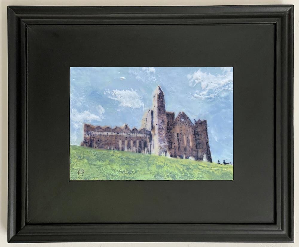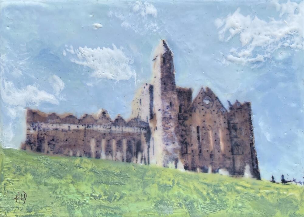$130 for FRAMED piece. The Rock of Cashel, located in County Tipperary is a medieval castle. The Rock of Cashel was the traditional seat of the kings of Munster. In 1101 the King of Munster, donated his fortress on the Rock to the Church. The picturesque complex has a character of its own and is one of the most remarkable collections of Celtic art and medieval architecture to be found anywhere in Europe. This encaustic piece incorporates a toner transfer and pan pastel. (Encaustic is a process in which you paint with melted wax, fusing each layer together. When polished it gives a luminescence not seen in other mediums.)
