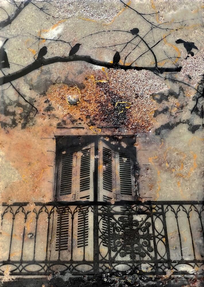 $150 for FRAMED piece. This encaustic is a study for a larger piece I created later. The balcony is located in Saumer, France. Materials used were stone spray paint, burnt shellac, toner transfers and encaustic.(Encaustic is a process in which you paint with melted wax, fusing each layer together. When polished it gives a luminescence not seen in other mediums.) |