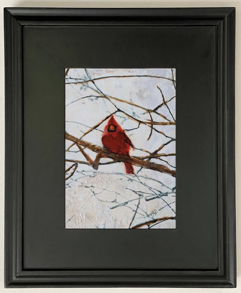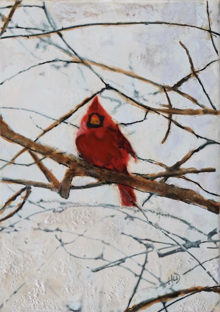 $130 for FRAMED piece. This cardinal visits me every winter for bird seed but he is most magnificent against a snowy background.(Encaustic is a process in which you paint with melted wax, fusing each layer together. When polished it gives a luminescence not seen in other mediums.)
