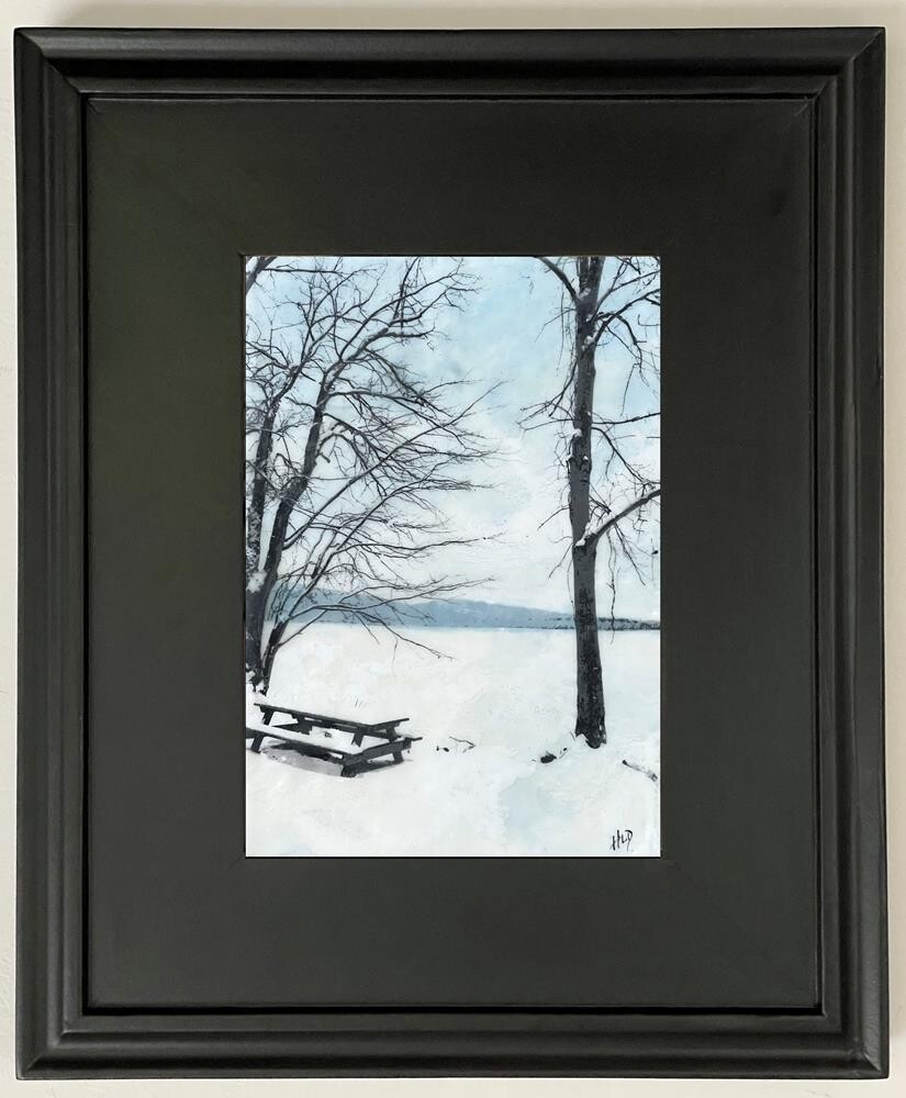 $130 for FRAMED piece. I took a hike around this lake which has a beauty all it's own in the winter, with the snow covering everything. This encaustic incorporates a toner transfer. (Encaustic is a process in which you paint with melted wax, fusing each layer together. When polished it gives a luminescence not seen in other mediums.)