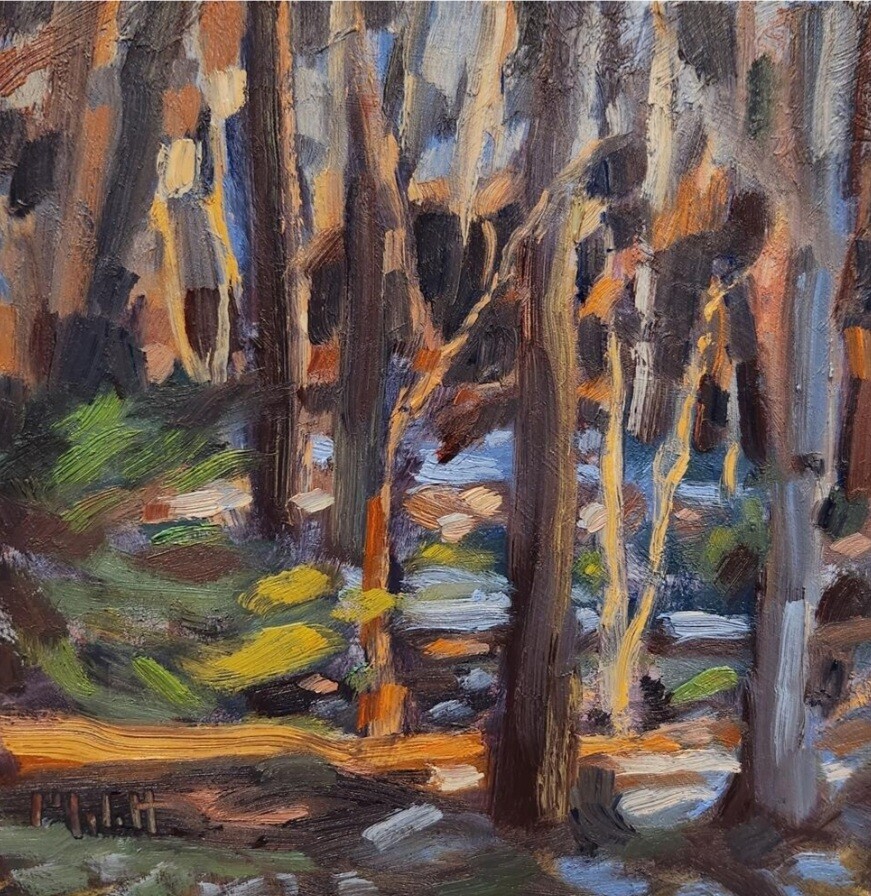 2023 orig Winter Color. 6x6 inch oil on panel. Lots of color at the golden hour in the woods.