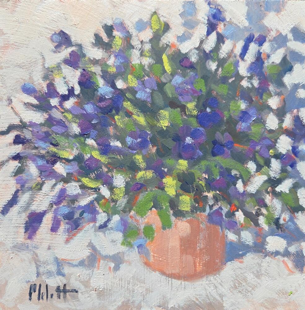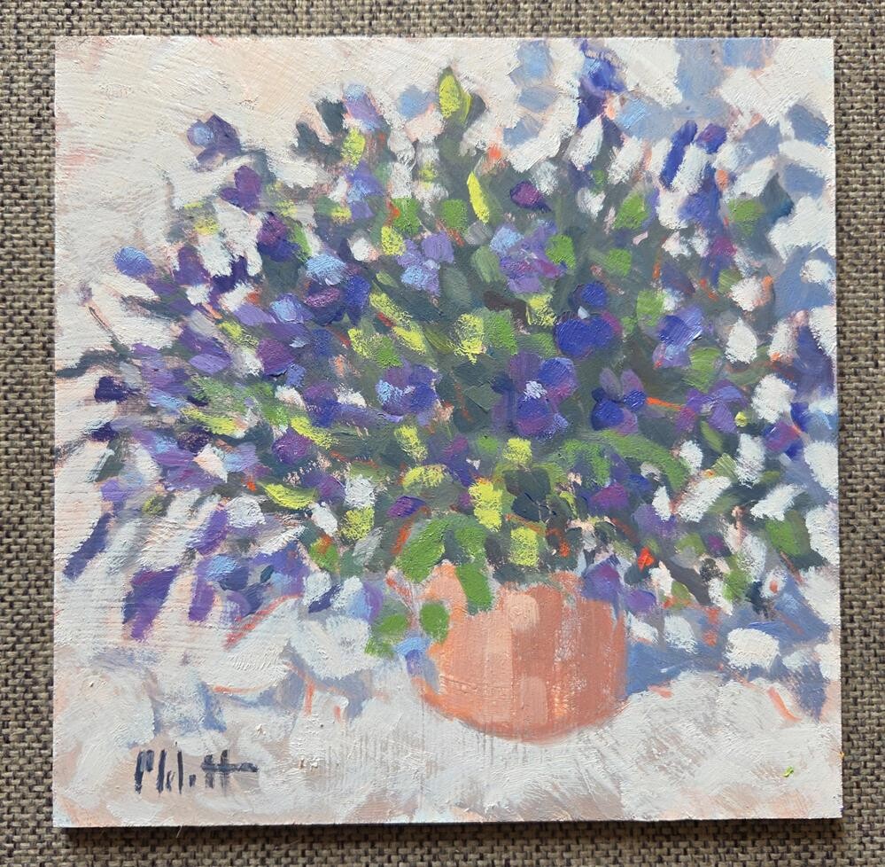 Still life, purple flowers. I can't remember the name of this plant. I think it is in the violet family. Either way it was fun to paint. 6x6 oil on panel. Still life, purple flowers. I can't remember the name of this plant. I think it is in the violet family. Either way it was fun to paint. 6x6 oil on panel. |
