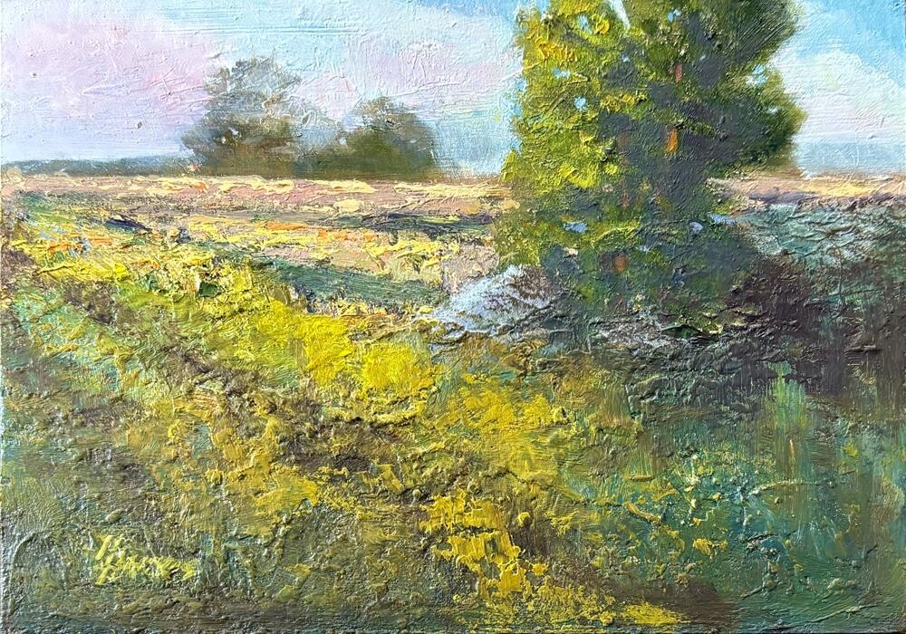 "Fallow" revisits a familiar field, capturing its changing character with the seasons. This small oil painting uses thick, textured brushstrokes to depict a sunlit rural landscape. A lone tree stands amid yellow and green vegetation in the foreground, while a soft-hued field stretches toward distant trees under a calm sky. The impasto technique adds depth and highlights the quiet beauty of nature’s subtle shifts. "Fallow" revisits a familiar field, capturing its changing character with the seasons. This small oil painting uses thick, textured brushstrokes to depict a sunlit rural landscape. A lone tree stands amid yellow and green vegetation in the foreground, while a soft-hued field stretches toward distant trees under a calm sky. The impasto technique adds depth and highlights the quiet beauty of nature’s subtle shifts. |