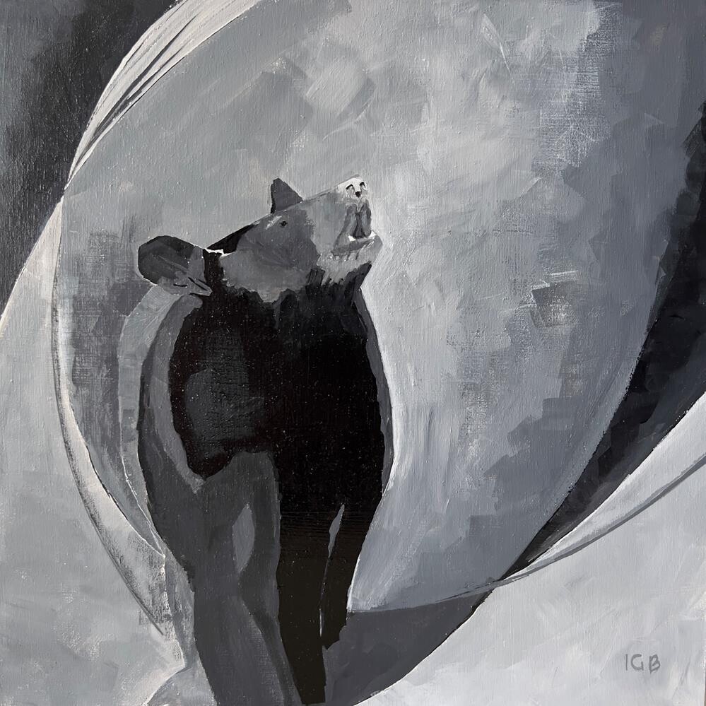 This painting emerged from the memory of an adolescent black bear who once stalked the edges of my homestead.Since then, bear appears in my dreams and consciousness when themes of protection and boundaries surface. These visitations have become guides, calling me into presence and helping me discern when to stand my ground and when to retreat.This painting honors that encounter--the membrane between wild and domestic, between fear and respect, between what we control and what we cannot. In these brushstrokes lives my reverence for bear--teacher of boundaries, embodied power, and mirror to our most primal selves.