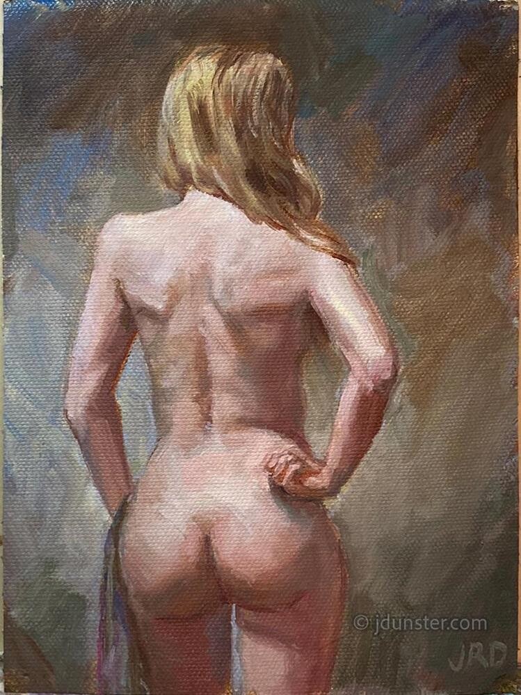 This is a little study painted on a SHEET OF PRIMED CANVAS (not a panel or stretched), and as such, it is priced accordingly. You can easily mount it on a board yourself, or just place it in a frame with a rigid backing board to support it. You can see there are scraps of tape on each side of the canvas; these were to keep the sheet of canvas secured to the board I had propped up on my easel. (This board is not included with the painting.) I have removed the tape and painted all edges of the sheet of canvas. After taking Arthur Gain's figure painting workshop, I'm doing more figure studies. This is a little 6x8" study painted from one of the reference photos that Mr. Gain provided for his students for the class. I don't pretend to possess his genius for painting; I'm going to review the workshop (which is available online) to study more. Ships to the USA via the online shopping cart on my website (the Buy Now link at the top of the page will take you there). If you are outside of the USA and want to buy the painting, please contact me through DailyPaintworks or through the contact form on the other site. This is a little study painted on a SHEET OF PRIMED CANVAS (not a panel or stretched), and as such, it is priced accordingly. You can easily mount it on a board yourself, or just place it in a frame with a rigid backing board to support it. You can see there are scraps of tape on each side of the canvas; these were to keep the sheet of canvas secured to the board I had propped up on my easel. (This board is not included with the painting.) I have removed the tape and painted all edges of the sheet of canvas. After taking Arthur Gain's figure painting workshop, I'm doing more figure studies. This is a little 6x8" study painted from one of the reference photos that Mr. Gain provided for his students for the class. I don't pretend to possess his genius for painting; I'm going to review the workshop (which is available online) to study more. Ships to the USA via the online shopping cart on my website (the Buy Now link at the top of the page will take you there). If you are outside of the USA and want to buy the painting, please contact me through DailyPaintworks or through the contact form on the other site. |