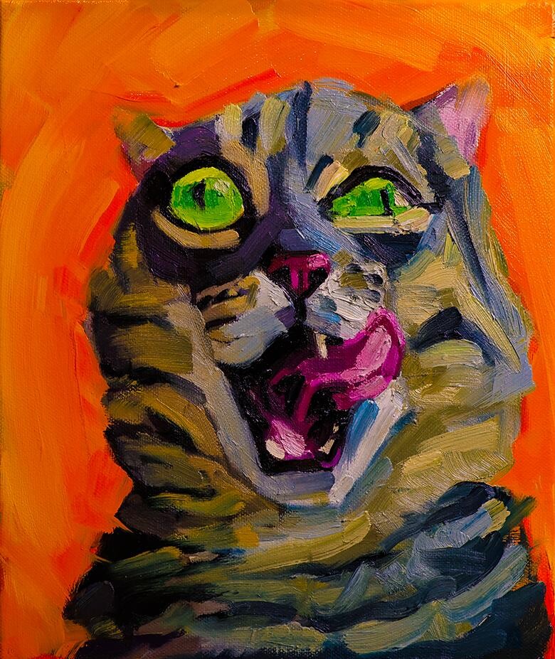 One Crazy Kitty (Oil on canvas, 10 x 12 inch) I decided to painted this crazy cat because it captured my soul a little bit. If you are looking to spice up your life and add a bit of chaos into your life, considering purchasing this kitty.