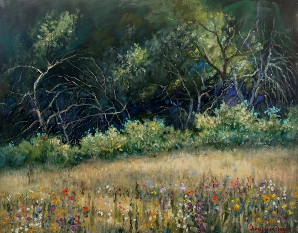 "His Gift to Me" is a mixed media painting on stretched canvas. Unframed. It is a painting of my naturally landscaped backyard. It is a gift to me from my Heavenly Father.
