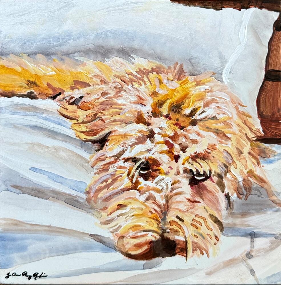 One of the nine paintings in the 2025 Tiny show at STUDIO Gallery in San Francisco. My little muse is more like a person with fur. Available through the gallery, they make it very easy and will ship right to your door. www.studiogallerysf.com