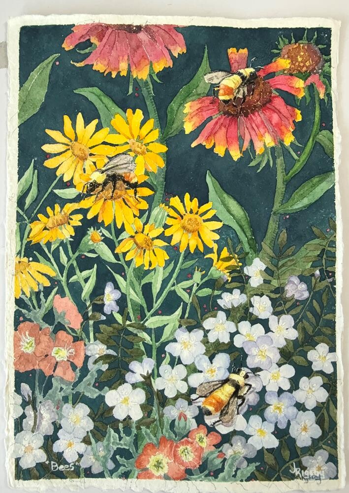 I created 3 full bee paintings for a commission and this one is now available for purchase. Bees enjoying a bounty of flowers. "Bees" is a pen and watercolor on deckled edge watercolor paper. This painting is unframed and shipped in an envelope. I created 3 full bee paintings for a commission and this one is now available for purchase. Bees enjoying a bounty of flowers. "Bees" is a pen and watercolor on deckled edge watercolor paper. This painting is unframed and shipped in an envelope. |