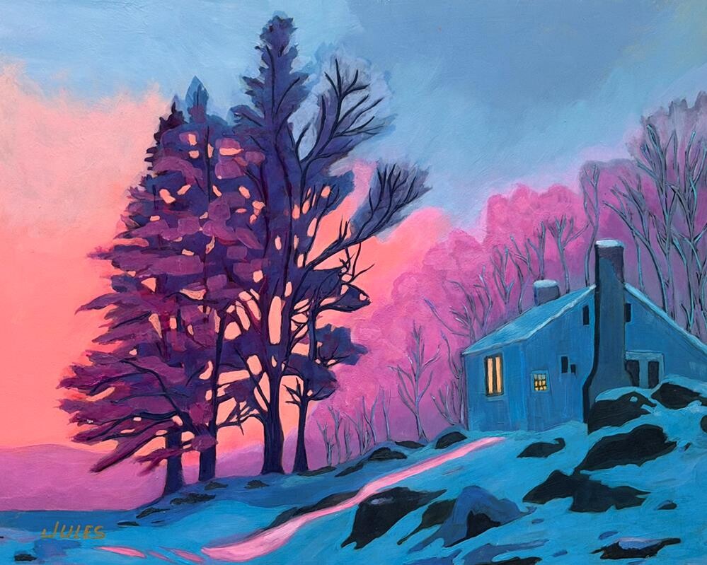 Dusk’s Embrace captures a quiet winter moment just as day slips into night. Measuring 16 by 20 inches and painted in acrylic, this piece centers on a delicate balance of light and shadow. On the left, a group of tall, slender trees stands dark against a sky that shifts gently from warm pink-orange tones into cool, calming blues. Their branches are intricate yet bare, tinted with subtle purples that deepen the mood. To the right, a small blue house glows softly from within, its lit windows offering a tender contrast to the cold snow and rugged rocks surrounding it. In the distance, faint trees in soft pink and purple hues add layers of gentle texture, reinforcing the stillness of a winter twilight. This work grew from my fascination with the way winter sunsets reflect on snow—how light bends and colors blend to create an atmosphere both peaceful and vivid. Choosing the right colors was key to expressing that fleeting warmth amid the cold. Dusk’s Embrace invites you into that moment of calm transition, where day’s last light holds the landscape in a quiet, heartfelt embrace. Dusk’s Embrace captures a quiet winter moment just as day slips into night. Measuring 16 by 20 inches and painted in acrylic, this piece centers on a delicate balance of light and shadow. On the left, a group of tall, slender trees stands dark against a sky that shifts gently from warm pink-orange tones into cool, calming blues. Their branches are intricate yet bare, tinted with subtle purples that deepen the mood. To the right, a small blue house glows softly from within, its lit windows offering a tender contrast to the cold snow and rugged rocks surrounding it. In the distance, faint trees in soft pink and purple hues add layers of gentle texture, reinforcing the stillness of a winter twilight. This work grew from my fascination with the way winter sunsets reflect on snow—how light bends and colors blend to create an atmosphere both peaceful and vivid. Choosing the right colors was key to expressing that fleeting warmth amid the cold. Dusk’s Embrace invites you into that moment of calm transition, where day’s last light holds the landscape in a quiet, heartfelt embrace. |
